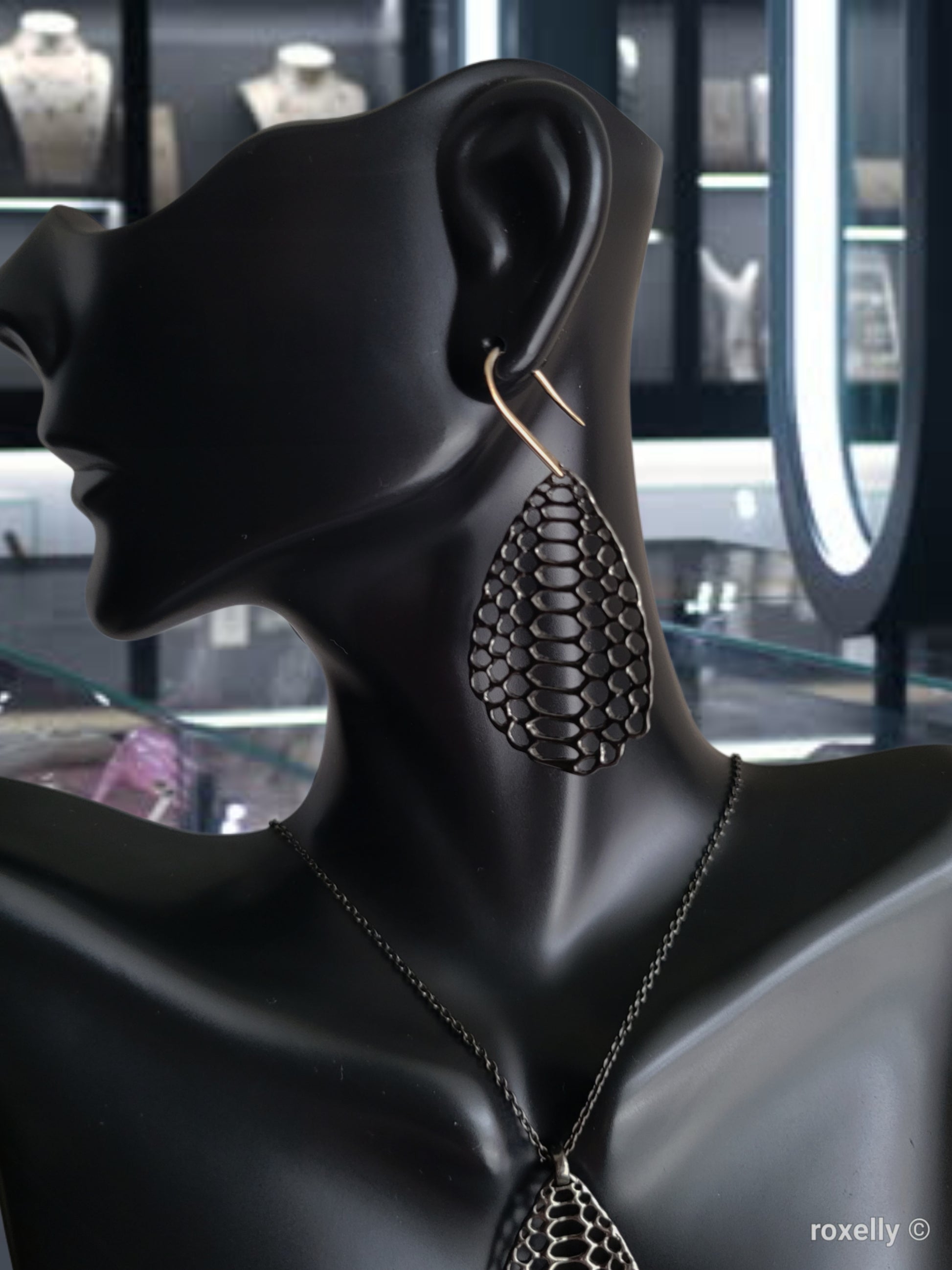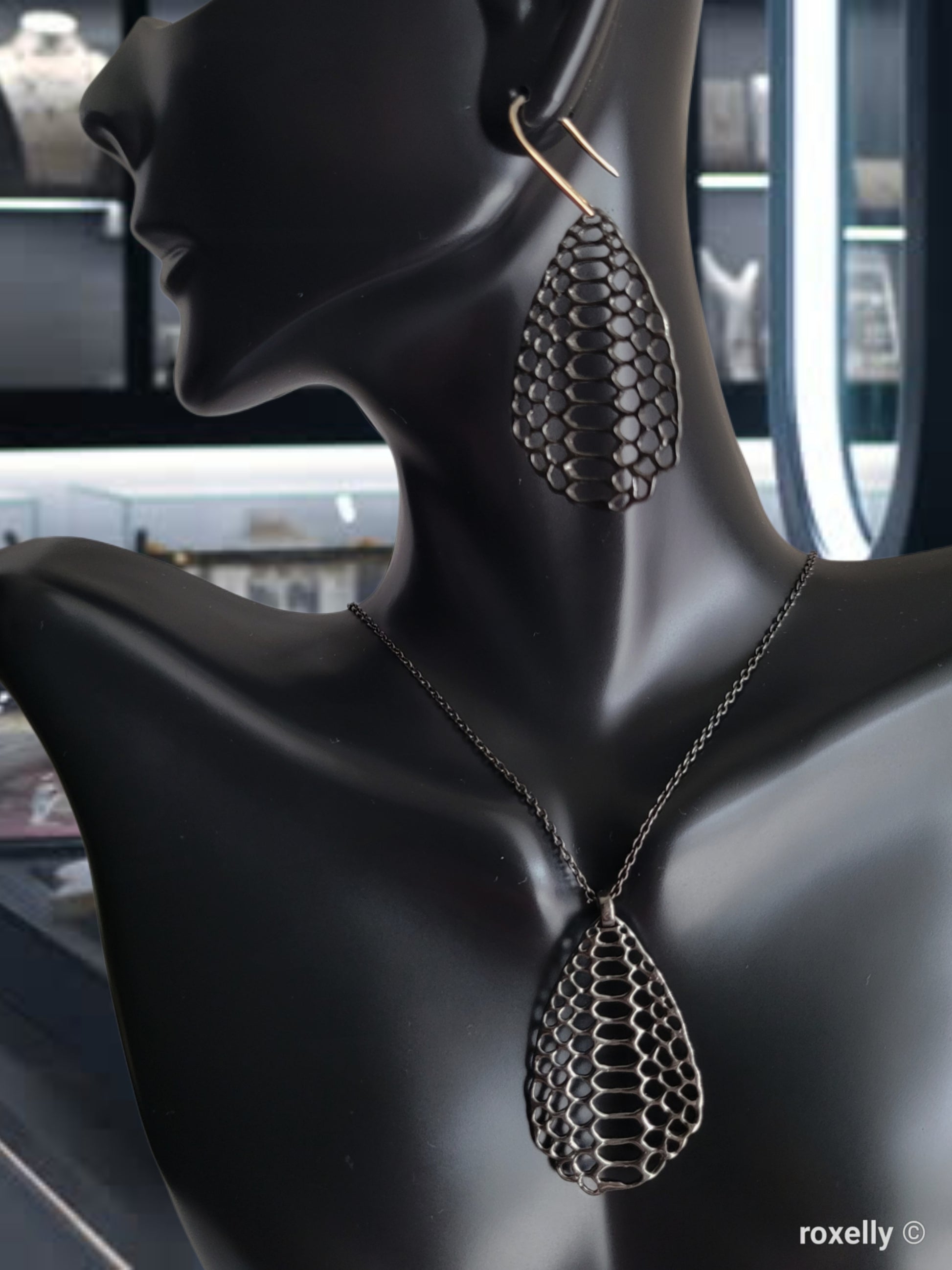 ❤️ Oxidized Sterling Silver Earrings Necklace Set, Designer Mesh Drop, the hooks are 14k Gold
